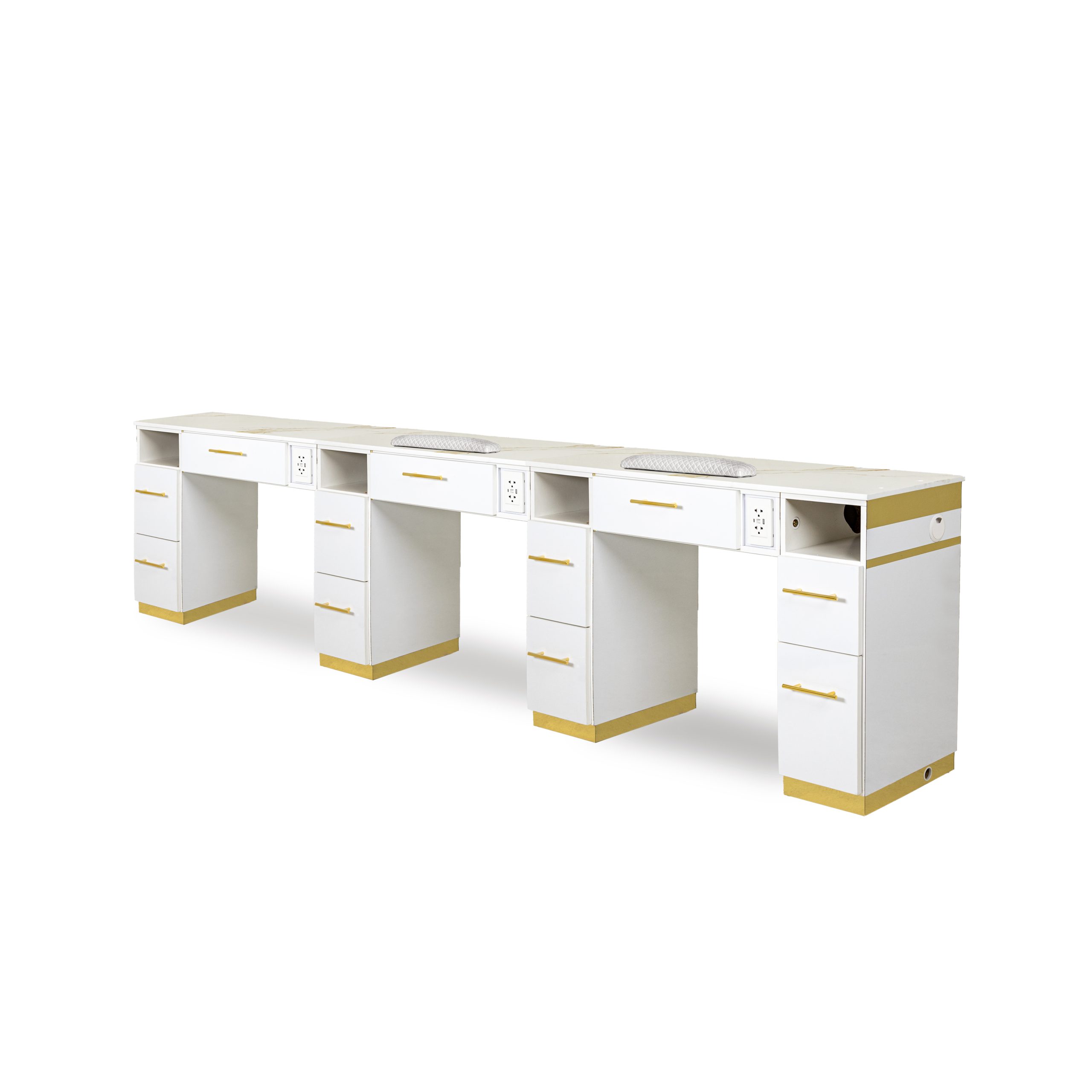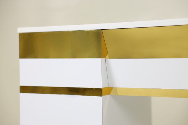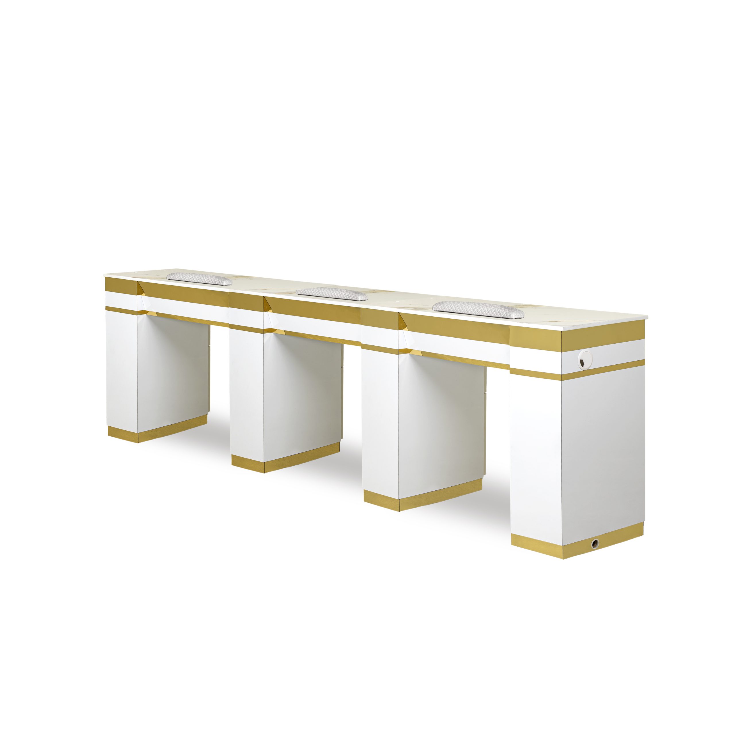 T-SPA Evee Gold Triple Table features 3 tabletops and 4 table legs, comes in 2 colors: White/Gold complemented by a Gold Marble Counter top. Suitable for a simple luxurious style.
