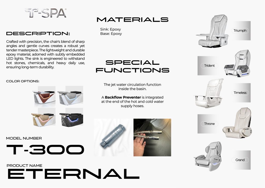 The ETERNAL Pedicure Chair T-SPA is a symbol of sophistication and durability. Not only boasts beauty but also ensures long-term stability.