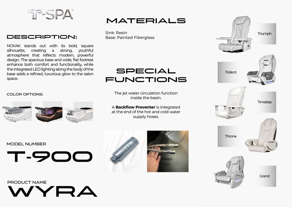WYRA is a pedicure chair design owned by T-SPA. The design concept, structure, and specifications are developed under T-SPA’s direction, with strict quality standards applied to ensure durability, performance, and consistency.